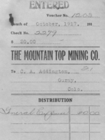 Size: bill is 3 7/8" x 5 3/8", voucher is 8 1/2" x 7". Included is the statement from C.A. Addington, a livery stable, for the rent of a team on Oct. 8 & 9, and horses on the 20, 23, 26, and 27. Rent for a team of horses for two days was $8, and for each horse individually, $2. The yellow copy is the check voucher from the Mountain Top Mining Co. The Mountain Top mine is in Governor Basin, just to the south and east of Yankee Boy Basin, to the southwest of Ouray, Colorado.